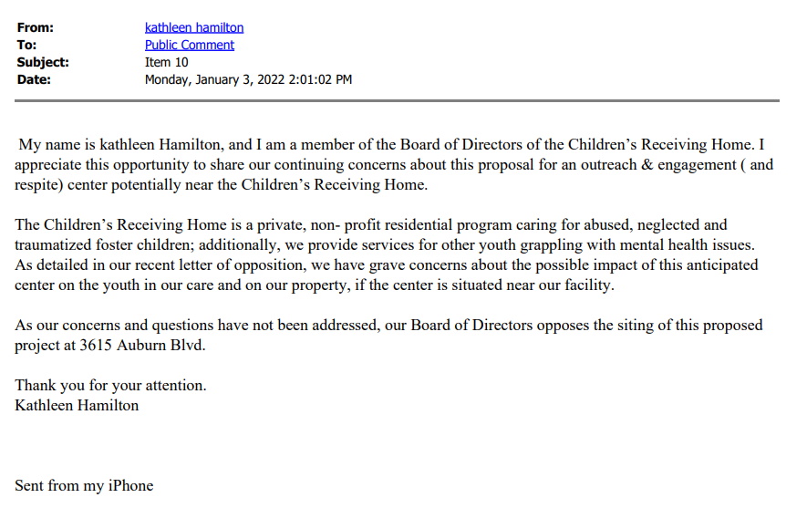 Receiving Home Public comment Sacramento City Hall January 3,