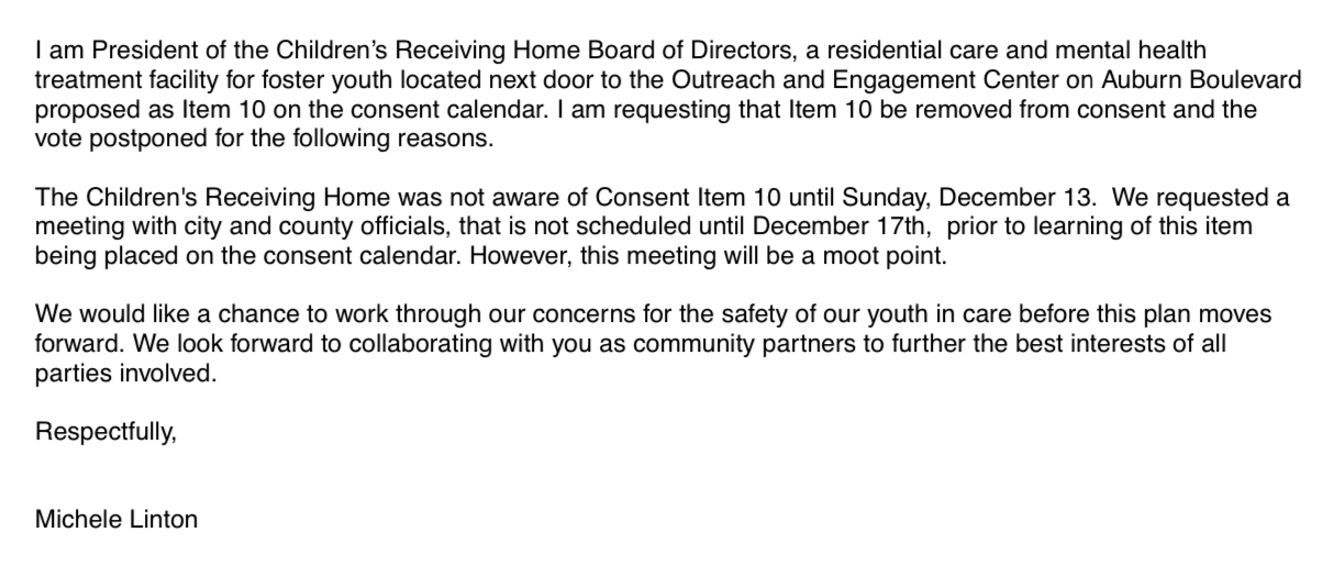Receiving Home Public comment to Sacramento City Hall December