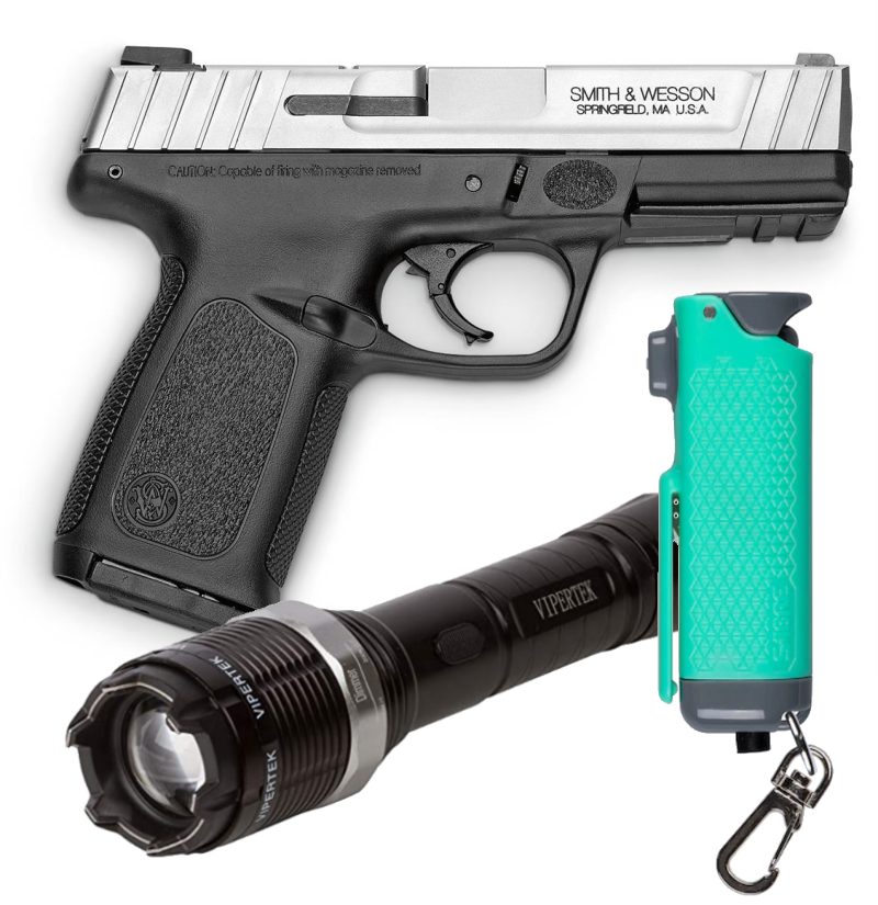 The ultimate form of protection is a handgun. A good defensive gun, such as the Smith & Wesson SD series (SD = self defense), will cost around $400. Handguns can be purchased at stores like the